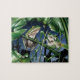 Det här pusslet har en bild av ett par grönt träd grodor över vatten. Målningen är av konstnären Dawn Witherington.