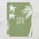 Den tropiska Bröllop spara datum i Grönt vid Träd har en lush-design med en sjudande grönt handflatan träd, perfekt för att meddela er Handflatorna dag med lite exotisk elegans och tropisk charm.