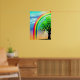 Poster i en grönt, vattenfärgen träd, mot ett blå himmel och en levande färgad regnbåge