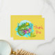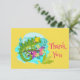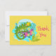 Ett tackkort med en söt illustration av en grönt tropisk ödla omgiven av löv och blommor på en turkosa blå färg.