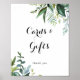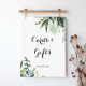 Denna gröna tropiska kalligrafi-kort och present-skylt är perfekt för ett modernt bröllop eller brudvisning. Designen har främst gröna tropiska blad.