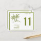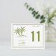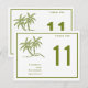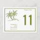 Detta kort för bordsnummer är rent och enkelt och har två gröntar handflatan träd och gräns utanför kant i samma grönt färg. Bron & Grooms namn och bröllop-datumet ligger under handflatan. Bordsnumret är tydligt och läsbart. Baksidan är den exakta utformningen så att den kan ses från båda sidor. Det är perfekt för tropisk torka, strand, kust, havsområde eller havsdekoration bröllop.
