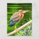 En fågel med lång näsa är på väg mot en metall-räls, bredvid ett kedjestängsel och en grej, med en serenkropp av vatten i bakgrunden. Scenen är vibrerande med lush foliage och reflexioner i vatten.