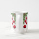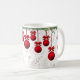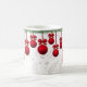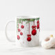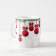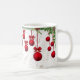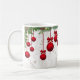 Röda, farliga julprydnadsföremål, som är upphängda från en svag av barrhärdar och hjullerpiga, som läggs ovanpå en bakgrund av lätt färgad barr teckning, gör helgdagarna till en vacker Mugg!