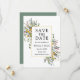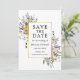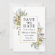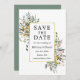 Modern Watercolor Wildblomma Bröllop Bröllop Förlovning Announcement Save Datumkortet omfattar gult, rosa, lila, blommor i dammig, blått och vitt vild, eukalyptus löv, grönt av sage löv och annat botaniskt grönt på guld. Skicka tillbaka Grönten.