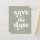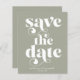 Budget Modern Snyggt Typography Bröllop spara datum i modern neutralt boho shade of sage grönt. Perfekt för att ge dina framtida gäster kännedom om din lycklig-händelse eller förlovning! Kontakta oss på cedarandstring@gmail.com om du behöver hjälp med designen eller matchande produkter.
