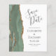 Det moderna bröllop spara datum-kortet, som är lämnat kant i eleganten, har en grönt vattenfärgad agate gräns som trimmas med faux guld glitter. Med anpassadet kombineras grått-handskrift, tryckplåt och kursivt typsnitt på vit bakgrund. Den omvända sidan har en matchande sidstorlek och guld agate-grönt.