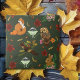 En röd räv, kanin, uggla, luna, gräs marten med höst löv, pumpor, blommor och akorner i en bakgrund av djup grönt
