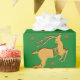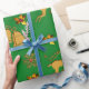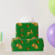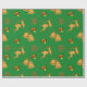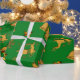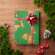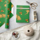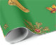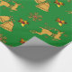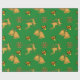 En julomslutning papper med en mönster av guldrenar, klockor, guld holly med röda jordgubbar, och guld snöflingor med traditionell grönt vid jul.