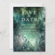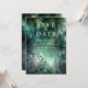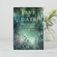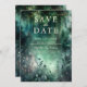 En vit vattenfärgsillustration av lush foliage in emerald grönt, som gungar med fairy ljus och magiskt damm, dekorerar detta sommarbröllop i vår förutom datuminbjudan med ett förändrad skogstema. En elegant, modern räddar datumet för ett sagolikt bröllop. Perfekt för brider som kärlek den sagda skogsmiljön, mjölskogen eller trädgårdstemat och framkallar grönt med en aning lavendellila.