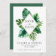 Modern utformning av bröllop spara datum-kort med vattenfärgat tropiskt grej som monstera och handflatan löv på vit bakgrund. Kortets omvända sida är i grönt färg. Perfektens bröllopsinbjudan till stil för tropiska bröllop, destinationer och strandbröllop.