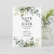 Modern Elegant Watercolor Botanical Grey Save Datakortet omfattar eukalyptus löv, grönt botaniskt löv, dammiga blå löv och andra vackra botaniska grejer. Foto bakåt.