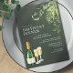 Finare-middagsbjudanden med en vattenfärgad illustration av en berömmande champagne flaska med två fyllda glas. Texten kan redigeras helt. Vittext på en kontrasterande mörk grönt bakgrund. (färg i bakgrunden kan ändras om så önskas med hjälp av verktyg)
