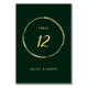 Det här bordsnumret i bröllop har en faux-guld-cirkel, ram och enkel kalligrafi med en grönt i skogen.