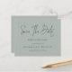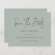 Grönten Budget Minimalist Script Light Sage sparar datumet. Ett budgetmässigt prist mindre än 4,5 x 5,6 tum alternativ. Finns i ett SEMI-GLOSS 110 lb-kort LAGRAR som är ungefär lika tjockt som ett vykort. Det finns EN per lakan. Enkel elegans med Spara datum i ett modernt set skript.Resten av texten som du enkelt kan anpassa.Visar här i svart på grönt Sage, men färgen text och bakgrund kan ändras om du vill genom att anpassa ytterligare alternativ.