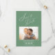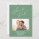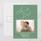 Lägg märke till att det här vackra fotot sparar datumkortet för bröllop som kommer. Utformningen innehåller ett vågrät-foto ram på framsidan som är accentuerat med eleganten "Spara datum" på en sidas grönt-bakgrund. Lägg till webbplatsen bröllop på baksidan.