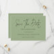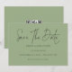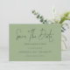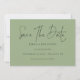Grönten Spara datum med minimal skriptväxling. Tillgänglig digitalt och utskriven. Enkel elegans med Spara datum i ett modernt set skript.Resten av texten som du enkelt kan anpassa.Visar här i svart på grönt Sage, men färgen text och bakgrund kan ändras om du vill genom att anpassa ytterligare alternativ.