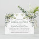 Modern Elegant Watercolor Botanical Grey Inbjudningskort för möhippan Card omfattar eukalyptus löv, grönt botaniskt löv, dammiga blå löv och andra vackra botaniska grejer. Trendig Calligraphy Script. Skicka tillbaka Grönten.
