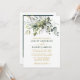 Modern Elegant Watercolor Botanical Grey Wedding Card omfattar eucalyptus löv, grönt botaniskt löv, dammiga blå löv och andra vackra botaniska grejer. Grönt och Guld-skript. Foto bakåt.