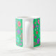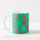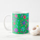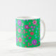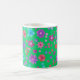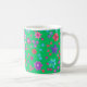 En söt, blommigt kaffe mugg, med en mönster av ljusa blommor i lila, turkos, rosa och orange mot bakgrund av en Jade-Grönt, från en handmålad papper kollage av Judy Adamson. Om du vill kan du enkelt ändra bakgrunden till färg genom att klicka på Redigera.