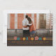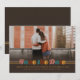 En grupp Spara datumet med en återgångsvy med färgstarkt rand och orden "Spara datumet" i 70-talets alternerande färg på en brun övertoning. Enkel att anpassa med ditt foto och din information.