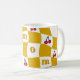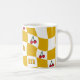 Transport yourself back to the groovy 70s with this vibrant distorted checkerboard mug design. Featuring a playful pattern of sunny mustard yellow and crisp white squares, interspersed with adorable cherry motifs, this mug is a perfect nod to the kitsch kitchen aesthetic of the era. Its retro charm makes it an ideal addition to your morning coffee ritual or a delightful accent piece of dopamine decor for your home. Enjoy a touch of nostalgic fun with every sip. Mom is editable for short names or initials.
