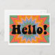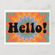 Perfekt för Postcross-pass, det här vykortet har en sjudande bakgrund och fet text som säger "Hej!" på framsidan.