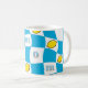 Retro-mugg från 70-talet med livfullt förvrängt schackbrädemönster och citrondesign. Muggens lekfulla mönster med himmelblå och krispiga vita rutor, med roliga citronmotiv däremellan, är en perfekt hyllning till tidens kitschiga köksestetik. Den retroa charmen gör den till ett perfekt tillskott till din morgonkafferutin eller en rolig accentdetalj för ditt hem med dopamin-dekor. Njut av en stänk nostalgisk kul med varje klunk. "Mom" är redigerbar för korta namn eller initialer.