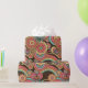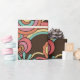 Groovy Retro Blommigt Kathrin Legg Wrapping Papper. Ett blommönster i orange, rosa och gula blommor, regnbåge och hjärtan på mörk choklad.