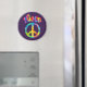 70-fredsteckenet med återutseendet runt magnet har ett grovfärgat med böjd text på mörkens röda bakgrund