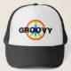 vanlig svart hatt med GROOVY på det och en regnbågefredstecken
