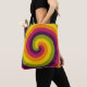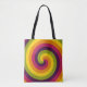 Den här bilden är en pulserande, psykedelisk spiral-design som består av tjocka, färgstarka band som snurrar från mitten utåt. Lilan färg - gult, orange, magenta, grönt och mörk - växla i ett upprepande, hypnotiskt mönster, och framkalla ett retro- eller popkonestetiskt. Den starka kontrasten och symmetrin skapar en känsla av energi och rörelse, skapar den synligt slående