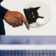 Det här är en minimalistisk pingpongplan med en platt illustration av en svart grumpy cat. Du kan anpassa texten!