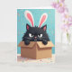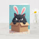 This card features a grumpy black cat peeking out of a plain brown box, centered so its fluffy chest, narrowed eyes, and furrowed brow take up most of the view. On its head sit oversized white bunny ears with pink inner lining 🐰, making the cat’s annoyed expression feel like reluctant participation in a sweet holiday joke. The background is sky-blue, sprinkled with floating round dots in soft candy-like colors, which adds a light, party feel around the cat’s stubborn stare. A few similar dots are scattered on the pale wooden surface under the box, like confetti that landed near its paws. The cat’s dark paws grip the box edge, and its tiny pink nose and thin white whiskers add a gentle touch that softens the grumpiness into something endearing, like a teasing moment between close friends. Any greeting text would sit neatly above the cat’s head in a simple pastel pink, leaving the character as the main focus 🌷. The box has crisp edges and a slightly darker brown interior shadow, set against the bright blue backdrop with multicolored dots drifting all around.