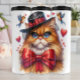 Den här visuella illustrationen visar en orange katt med ett något grumpigt uttryck och stort blått ögon. Katten bär en svart top hat med en röd båge och en matchande stor röd bågslips. Flytande av hjärtan och två tecknader med arg är i bakgrunden och skapar en humoristisk och kontrasterande scen.