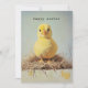 En flytande chick av gult med ett adoröst grumpy-uttryck sitter i ett orustiskt rede. Bilden i vintage 50-talets stil blandar realism och charm och skapar en vismisk men klassisk estetik.