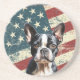 On this sandstone coaster, a watercolor portrait of a beautiful Boston Terrier Dog is placed against a grunge background of the USA flag. Perfect for any patriot who loves a Boston Terrier!