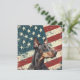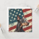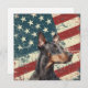A watercolor portrait of a beautiful Doberman Pinscher Dog is placed against a grunge background of the USA flag. The back of this all occasion flat card has a text field for you to customize.