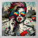 Unik konst som skildrar en vacker modern kvinna med rosa och blått hår, solglasögon som reflekterar staden, urbana bakgrunder efter apokalyptiska viber.