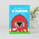 Födelsedagsfest inbjudan med en röd lada med massor av boskap. Framsidan har gått med oss på gården medan baksidan har party. Turkos bakgrund med vitt teckensnitt.
