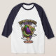 Grup, den nu officiell maskoten av Retro Hangover, spränger sig in på den vita/blå 3/4-Sleeven Raglan T, äggplanta och allt!