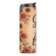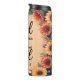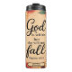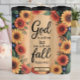 Svart skript på eleganten lyder "Gud är i henne kommer hon inte att falla" centrerad på en mjuk, späckad beige bakgrund, med Bibelversen "Psalm 46:5" nedan. Texten är vackert utformad av en levande arrangemang av solblommor av orange och gult, grönt löv och små blåbär som skapar en seriös och inspirerande blommigt.