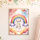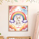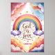 En pastell vattenfärg regnbåge omgiven av mjuka moln och gyllene stjärnor, med frasen "Gud är kärlek" i delikat kalligrafi.