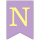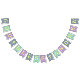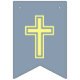 En flaggor banner som passar för dop, första nattvard eller religiösa konfirmationer. Flaggorna har alternerande nyanser av dammig blå, mintgrön och lila. Bokstäverna är gula. Det finns 2 gula kors mellan orden. Meddelandet är "Gud Välsigna" följt av ett 6-bokstavsnamn som du bör ändra bokstav för bokstav (standard är Andrew).