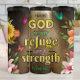 Den här inspirerande bilden visar den mäktiga bibliska versen "GOD är vår tillflykt och styrka" från "Psalm 46:1". Den framträdande gulten står mot en strålande, jordisk bakgrund. Viktiga arrangemang för blommigt i orange och rosa, tillsammans med grym rosa och tealfjärilar, är ett vackert ram av detta lugnande budskap från andlig.