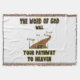 Den här täckfiltdesignen har ett kapsalon-kondenserat tryckteckensnitt med svart brev än en kontur som visar frasen "Guds Ord lyser din väg till himlen" med en samling gatuljus längs vägen plus ett tecken som visningar ord himlen att peka ut vägen i detta trosbaserade bibeltema. Denna Blankett tillverkas med 75% bomull och 25% polyester med en mycket mjuk hand som tvättar att rekommendera.