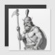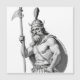 Illustration en noir et blanc d'un guerrier viking ou nordique musclé. Il porte un casque à cornes orné d'une plume ou d'un panache, et une cape. Le personnage tient une lance ou une hallebarde dans sa main gauche et arbore un physique imposant, avec un corps athlétique et musclé. Son visage est marqué par une expression sévère, avec un regard intense et une barbe touffue. Le style de l'illustration est très détaillé, ressemblant à une sculpture ou un dessin technique avec un grand souci du réalisme et des détails anatomiques.