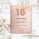 En gästbok för en feminin och glamorös 18:e födelsedagsfest. En snyggt ro-guld-faux-metallisk tittar bakgrund med faux glitter-damm. Lägg till ditt namn, text. Nummer 18 skrivs med ett stil-teckensnitt med ballong.
