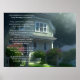 Bekvämt poster innehåller Rumis "gästhus"-dikt i vit text som täcker över en charmerande husbakgrund. Bilden skapades med AI Art software.