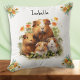 En söt kudde med en söt vattenfärg-stil illustration av en familj av marigold grisar och marigold blomma i varje hörn. Anpassa till namn, som kommer att stå ovanför grisar bild, i ett enkelt och modernt typsnitt. Baksidan av kudden är helt vit.